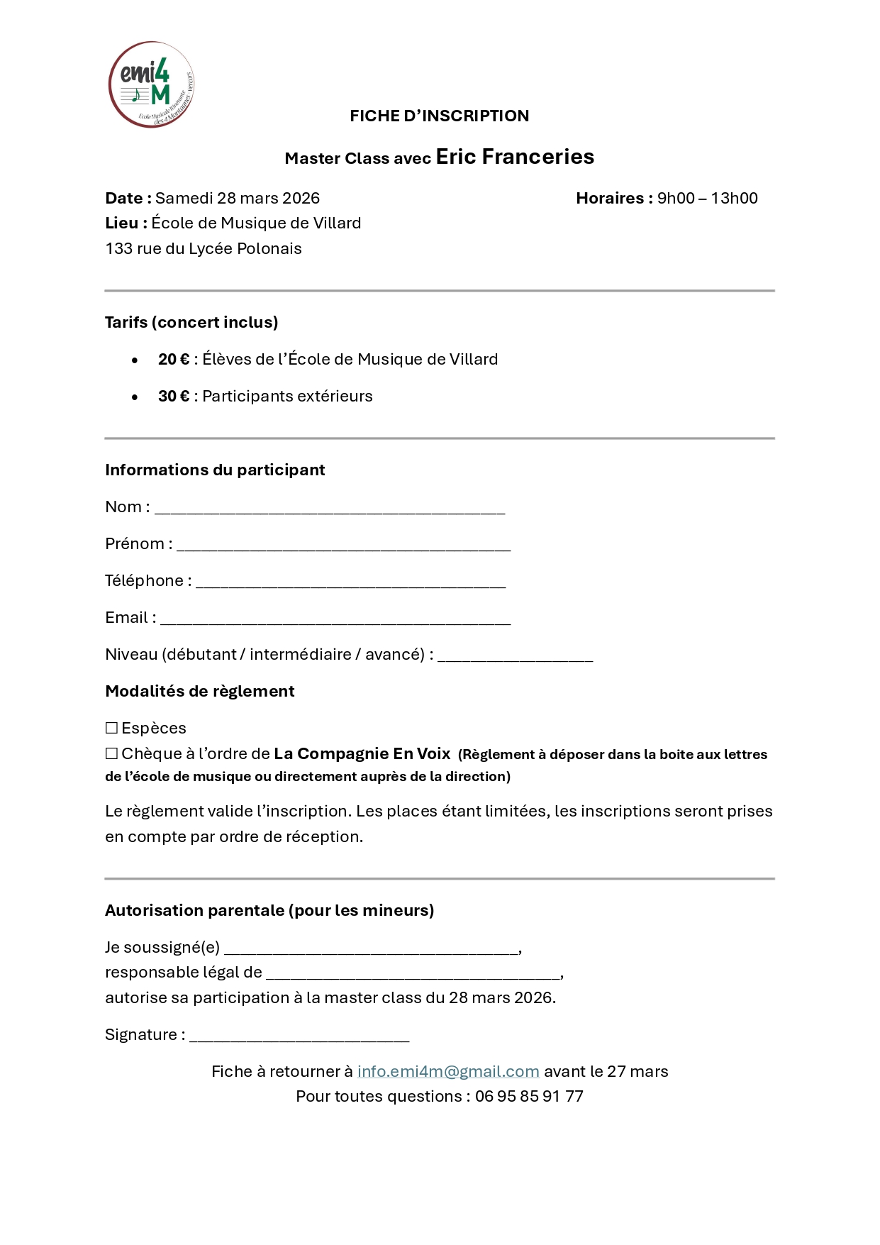 La fiche d'inscription sera à rendre avant le Vendredi 27 Mars. les places sont limitées.