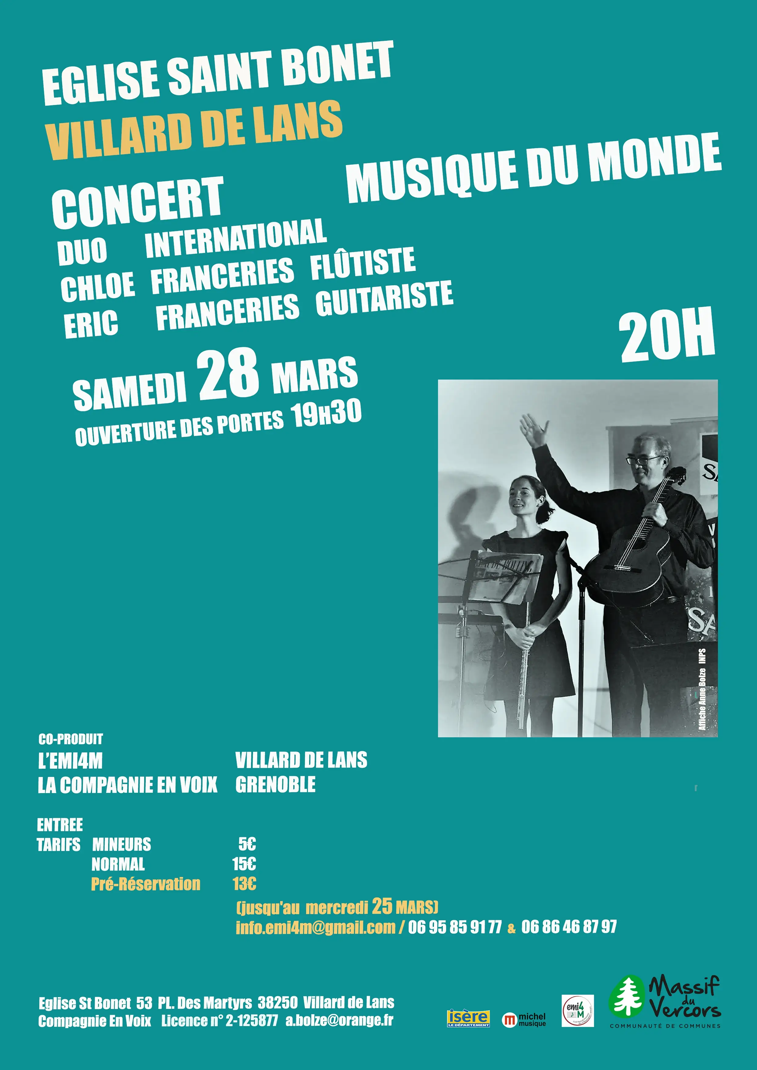 Le guitariste international Eric FRANCERIE se produira le Samedi 28 Mars 2026 à l'Eglise Saint Bonet de Villard de Lans à 20h;